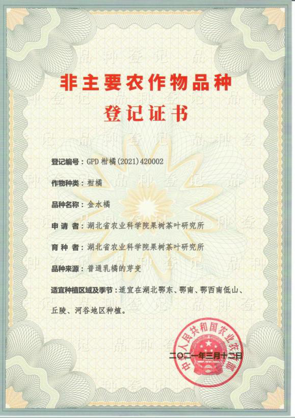 通过芽变选种方法,从‘乳橘’芽变枝条中选育而成。2021年3月12日通过农业农村部非主要农作物品种登记( GPD柑橘 (2021)420002)。生长健壮,果实扁球形,单果质量35.8 g,果皮橙黄或橙色,果肉细嫩,酸甜可口,风味浓,果汁含可溶性固形物14.1%,总酸0.76%,总糖 12.0%,维生素C 247 mg /kg,果实可食率80%,无核,品质优良,成熟期11月中上旬,耐贮藏,丰产期亩产可达2500kg以上。适宜在湖北省鄂中、鄂东南宽皮柑橘生产区种植。
