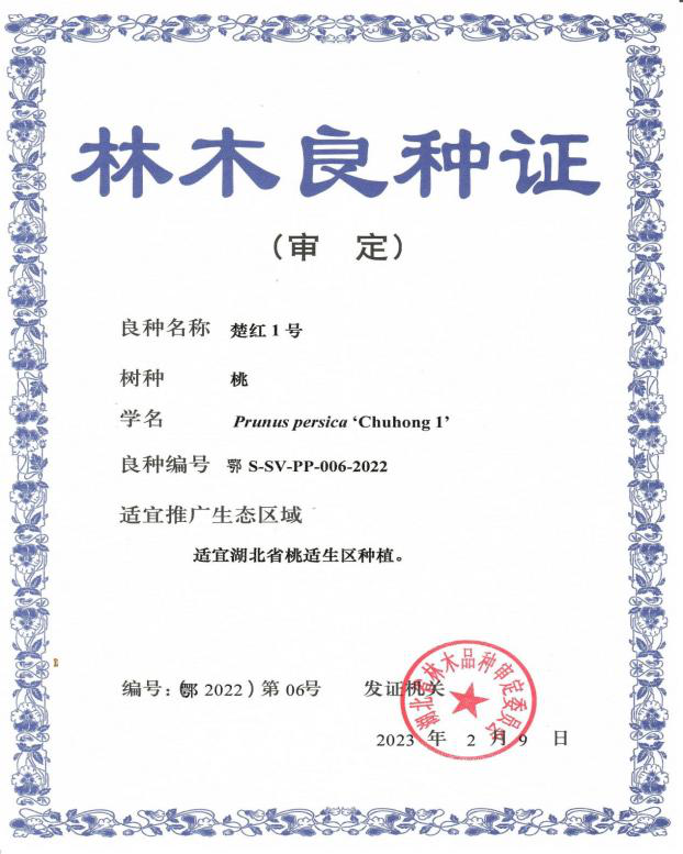 以‘枣油桃’为母本,‘早仙红’桃为父本常规杂交育种而成的红肉油桃特色品种。2023年2月9日通过省林木审定委员会审定(鄂S-SV-PP-006-2022)。树势强健,树姿半开张。5月中下旬果实成熟。果实生育期55-68天。果实圆形,平均单果重71 g,最大可达105克。果肉鲜红色,风味甜,可溶性固形物含量10%~12%,可滴定酸0.27%。果面光滑无毛、食用方便。盛果期平均产量为1200kg/667m2。适宜湖北省及气候相似区域种植,尤其可作为采摘观光桃园特色栽培品种。