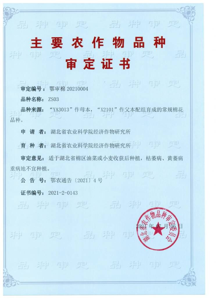 YA3013’作母本,‘X2101’作父本杂交,经系谱法选择育成的转 Bt 基因常规抗虫棉品种。2021年7月6日通过湖北省农作物品种审定委员会审定(鄂审棉20210004)。株高92厘米,植株筒型,茎杆有茸毛,叶片较大,叶色深绿,铃卵形,较小,铃尖突起中等,苞叶中大。生长势较强,整齐度好。生育期100.8天,第一果枝节位5.7节,果枝11.9 台。单株结铃13.1个,单铃重4.6 克,大样衣分38.09%。2018年和2019年在湖北省棉花品种区域试验中,皮棉产量分别为94.8Kg/亩和87.9Kg/亩。耐枯萎病、耐黄萎病,高抗棉铃虫。适于湖北省棉区油菜或小麦收获后种植。