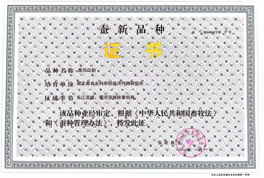 以‘Z831’作母本、‘Z842’作父本采用杂交育种、系统选育和定向分离等方法配组育成的二化,四眠,中日二元杂交秋用多丝量家蚕新品种。2022年12月30日通过国家畜禽遗传资源委员会审定(农17新品种证字第27号)。正交卵色灰绿,卵壳淡黄色,克卵1780粒左右。反交卵色灰褐,卵壳白色,克卵1830粒左右。良卵率98%以上。孵化齐一,二日孵化率98%以上。蚁蚕黑褐色,克蚁正交2460头左右,反交2360头左右。稚蚕有趋光趋密性,眠起齐,眠性稍慢。大蚕体色青白,普斑。食桑速度快,不踏叶,体型粗壮。上蔟齐涌,营茧快,营上层茧。茧形椭圆,茧色白,缩皱中粗,茧层厚。秋季催青10天,幼虫经过23天左右。实验室饲养,虫蛹率92.70%,茧层率24.06%。万头收茧量18.12kg,万头茧层量4.354kg。一茧丝长1160.4m,解舒丝长954.9m,解舒率83.0%,鲜毛茧出丝率19.96%,净度97.7分。农村饲养张种平均产茧量40.9kg,体质强健、好养,茧丝质优。适宜于长江流域、黄河流域蚕区秋季饲养。