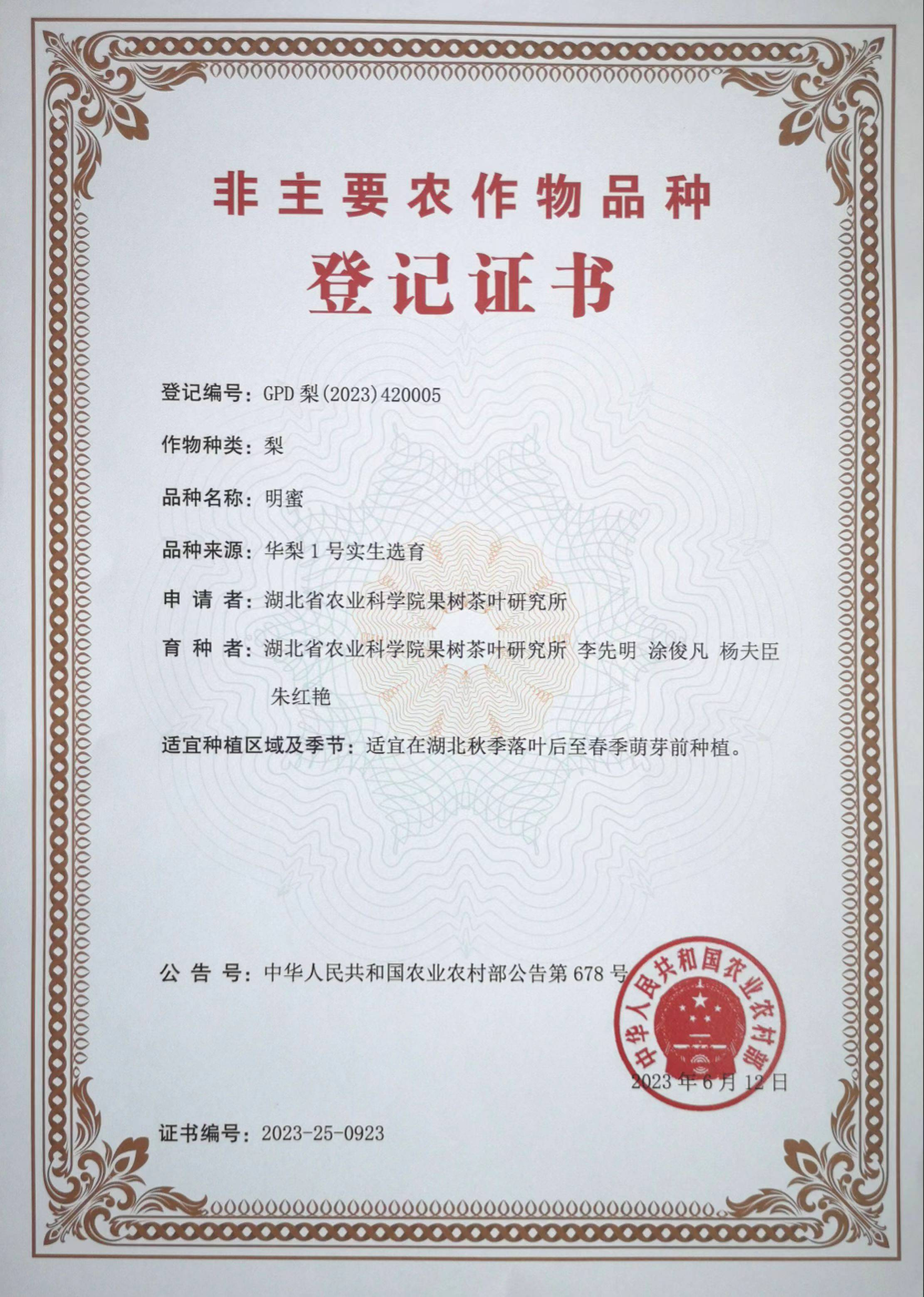 该品种由华梨1号实生选育而成。2023年6月12日获得农业农村部非主要农作物品种登记证书(GPD梨(2023)420005)。果实圆形,平均单果重302.0g,果皮褐色,果点中稀,果肉白色,肉质疏松,汁多味甜,可溶性固形物含量12.8%,总糖8.54%,总酸0.11%,维生素C33.5mg/kg,果实硬度6.26kg/cm2。果实汁多,味甜,有香味,品质上。果实成熟期8月上旬。盛果期亩产2500kg/667m2。该品种在武汉地区高抗黑星病,抗黑斑病、轮纹病。适宜生态气候条件一般为年降雨量800mm以上, 年平均气温15.4~16.7℃, ≥10℃年积温4879~5437的生态区域
