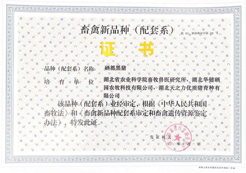利用地方品种恩施黑猪、梅山猪、湖北白猪等国内地方猪种资源,应用以全基因组育种为核心的‘4.0’生物育种技术,历时10余年培育出的优质猪新品种。2021年通过国家畜禽新品种(配套系)审定(农01新品种证字第33号),实现了湖北省国审生猪新品种‘从0到1’的突破。硒都黑猪肉质优良,肌内脂肪含量(IMF)3.75%,是瘦肉型猪的2倍;繁殖性能好,经产母猪产仔数13.76头/窝,高于省内地方猪种2.5头以上;料肉比2.8:1,较已培育的其他优质猪新品种具有显著优势。2022年入选2022(第二届)全国农业科技成果转化大会100项重大农业科技成果,2023年入选农业农村部主导品种(湖北省唯一入选畜禽品种)、湖北省农业主导品种、湖北省养殖业力推品种,获第三十届中国杨凌农业高新科技成果博览会‘后稷奖’,第二十五届中国国际高新技术成果交易会优秀产品奖。硒都黑猪广泛适应湖北省特殊的高(低)温高湿环境以及山区环境,符合市场多元化需求,已建立了完善的硒都黑猪‘核心群-扩繁群-商品群’三级金字塔高效良种繁育体系。适合规模猪场及中小规模养殖专业户饲养。