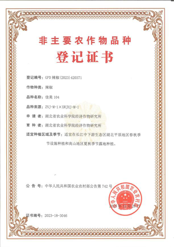 以‘ZNJ-M-1’为母本,‘XWJHJ-M-1’为父本配制的长灯笼型杂交一代品种。2023年12月26日通过农业农村部非主要农作物品种登记(GPD辣椒(2023)420371)。果实长灯笼形,长16.3厘米左右,横径4.9厘米左右,单果重65克左右,多皱褶,浅绿色,三心室或四心室,肉质脆,味微辣。维生素C含量71.3毫克/100克,辣椒素含量0.003%,水分含量90.5%,蛋白质含量1.1%。该品种平均产量3500 kg/667m2,中抗TMV、中抗疫病,较耐低温。适宜在长江中下游生态区湖北省平原地区春秋季节设施种植和高山地区夏秋季节露地种植。