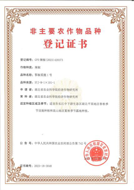 以‘XYJ-M-1’为母本,‘101-1’为父本配制的杂交一代品种。2023年12月26日通过农业农村部非主要农作物品种登记(GPD辣椒(2023)420373)。该品种果实羊角形,果形多皱褶,果实深绿色,果面皱,二心室,肉质脆,味辣,果长12.5厘米左右,横径2.8厘米左右,果肉厚0.14厘米,单果重16克左右,维生素C含量141毫克/100克,辣椒素含量0.07%,水分含量90.6%,蛋白质含量1.15%。该品种平均产量2500 kg/667m2,中抗TMV、中抗疫病,较耐低温。适宜在长江中下游生态区湖北省平原地区春秋季节设施种植和高山地区夏秋季节露地种植。