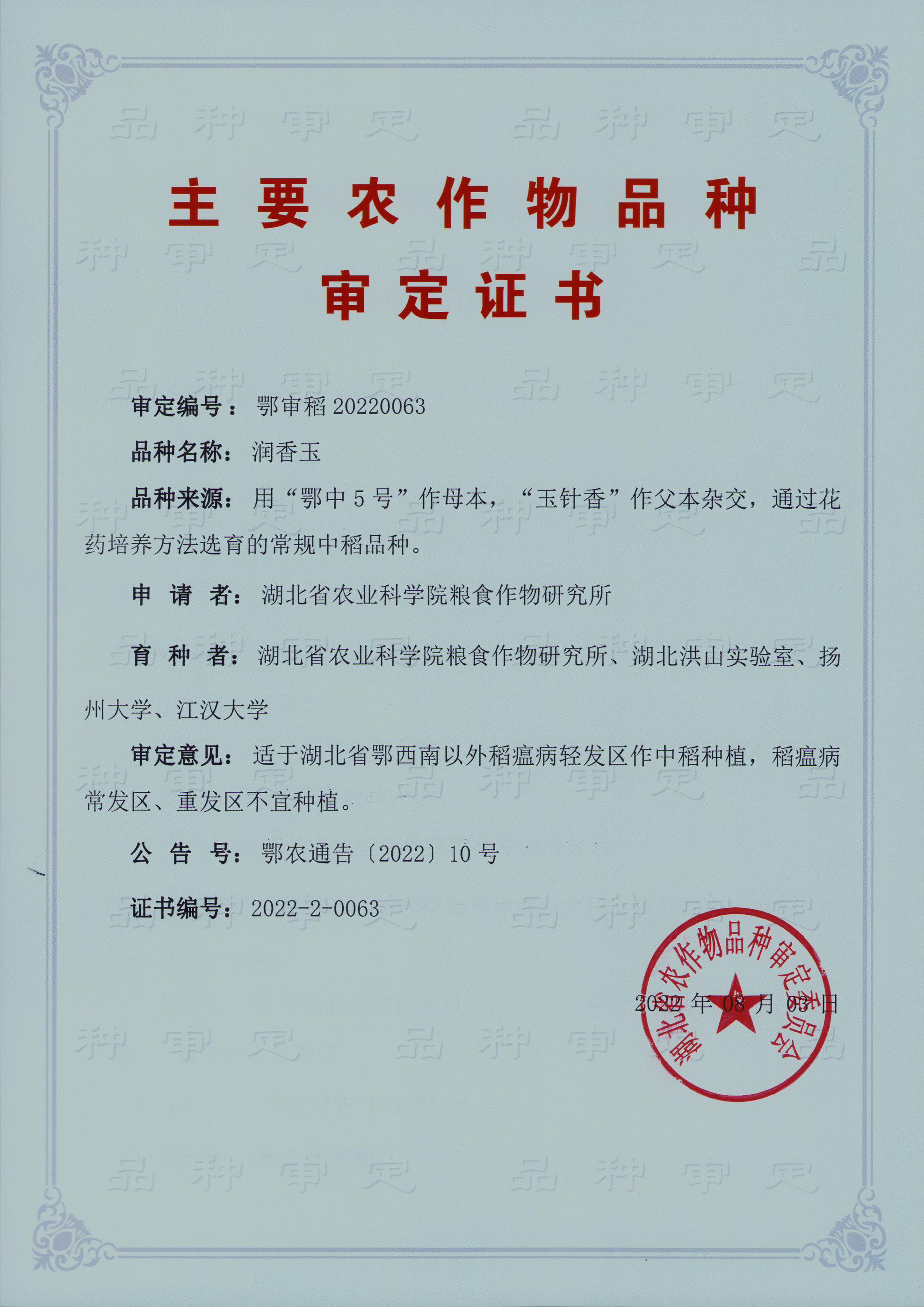 以‘鄂中5号’作母本,‘玉针香’作父本,通过花药培养方法选育的优质长粒食味香稻品种。2022年8月3日通过湖北省农作物品种审定委员会审定(鄂审稻20220063号)。全生育期117.1天,株高122.9厘米。两年区试平均亩产564.91公斤,比黄华占增产2.03%。亩有效穗21.4万,穗长25.7厘米,每穗144.2粒,结实率79.64%,千粒重25.16克。米质达《食用稻品种品质》标准二级。适合湖北省鄂西南山区以外地区作中稻种植。