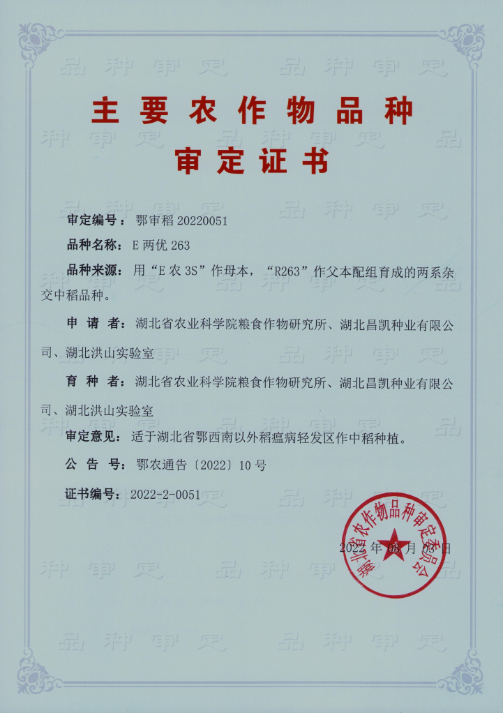 用两用核不育系‘E农3S’和恢复系‘R263’配组育成的两系杂交中稻品种。2022年8月3日通过湖北省农作物品种审定委员会审定(鄂审稻20220051号)。株高108.5cm厘米,株型适中,生长势旺,分蘖力强,叶色绿,剑叶长直挺,颖尖无色无芒。全生育期113.1天,比对照黄华占短0.2天。亩有效穗24.0万,平均穗长22.7cm,每穗141.2粒,结实率87.15%,长粒型,千粒重25.29克。稻瘟病综合指数4.7,稻瘟损失率7级,感稻瘟病;白叶枯病5级,中感白叶枯病;纹枯病7级,感纹枯病。耐热性1级,耐冷性5级。两年区域试验平均亩产650.19公斤,比对照黄华占增产13.28%。适合湖北省鄂西南以外稻瘟病无病区或轻发区作中稻种植。