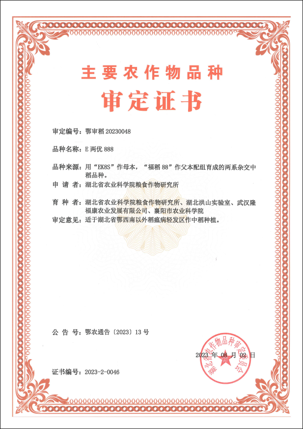 用‘EK8S’作母本,‘福稻88’作父本组配选育的两系迟熟优质中稻新组合。2023年8月2日湖北省农作物品种审定委员会审定(鄂审稻20230048)。全生育期 121.2天,比黄华占 长4.1天,属中熟籼稻品种。 株高112.3厘米,亩有效穗18.5万,穗长 24.3厘米 ,每穗182.1粒,结实率 82.4%,千粒重 23.43克。平均亩产597.5公斤。稻瘟综合指数4.9,稻瘟损失率7级,白叶枯病 1级,纹枯病5级。耐热性1级,耐冷性5级。糙率77.1% , 整精米率55.3% ,垩白粒率13%,垩白度2.2%,直链淀粉含量14.9%,胶稠度65毫米,碱消值6.0级,透明度级,透明度2级,长宽比3.9,米质达《食用稻品种品质》三级,稻米用品质感官评分81分。适于湖北省鄂西南以外稻瘟病轻发区作中稻种植。