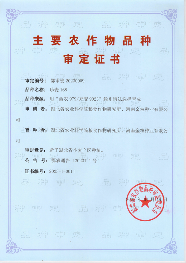 用‘西农979/郑麦9023’经系谱法选择育成的小麦品种。2023年1月19日通过湖北省农作物品种审定委员会审定(鄂审麦20230009),是2023年湖北省审定16个小麦品种中唯一的半冬性品种。株型紧凑,幼苗叶片细长、生长匍匐,分蘖力强,旗叶长度中等、上举。亩有效穗34.3万,穗长度中等,穗纺锤形,小穗着生密度中等,熟相好。每穗33.2粒,千粒重44.4克,生育期191.6天。籽粒卵圆形、白皮、角质。两年区域试验平均亩产412.98公斤,比对照郑麦9023增产7.30%。中感赤霉病,高感条锈病,中感白粉病,高感纹枯病。主要品质指标达中筋小麦品质标准。适于湖北省小麦产区种植。在2023年首届中国南方馒头小麦品种质量鉴评会上入选全国优质南方馒头小麦品种。
