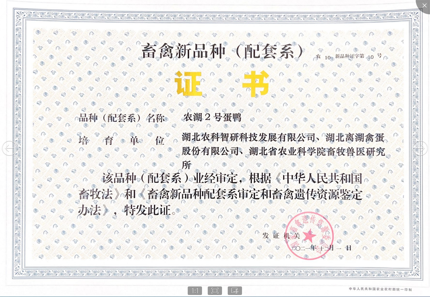 以湖北荆江鸭、绍兴鸭、山麻鸭等为主要育种素材,结合基因组芯片育种等现代育种技术,培育出的三系配套高产青壳蛋鸭配套系。2021年12月1日通过通过国家畜禽新品种(配套系)审定(新品种证字第10号)。父母代种鸭成年体重1487g,开产日龄118天,平均蛋重66.0克,66周龄合格种蛋数217个,入孵蛋孵化率83%。商品代蛋鸭0-16周龄成活率97.6%,17-72周龄成活率94.3%,开产日龄113天,饲养日产蛋数324个,平均蛋重66.7克,产蛋期料蛋比2.63:1,青壳率95%,72周龄体重1520克,全身羽毛麻色。该品种为国内笼养模式的首选品种,适合我国大部分区域饲养,养殖模式可采用笼养、放养、地面圈养等多种模式。2023年农湖2号蛋鸭商品代在省内襄阳、荆等地示范推广达200万只。