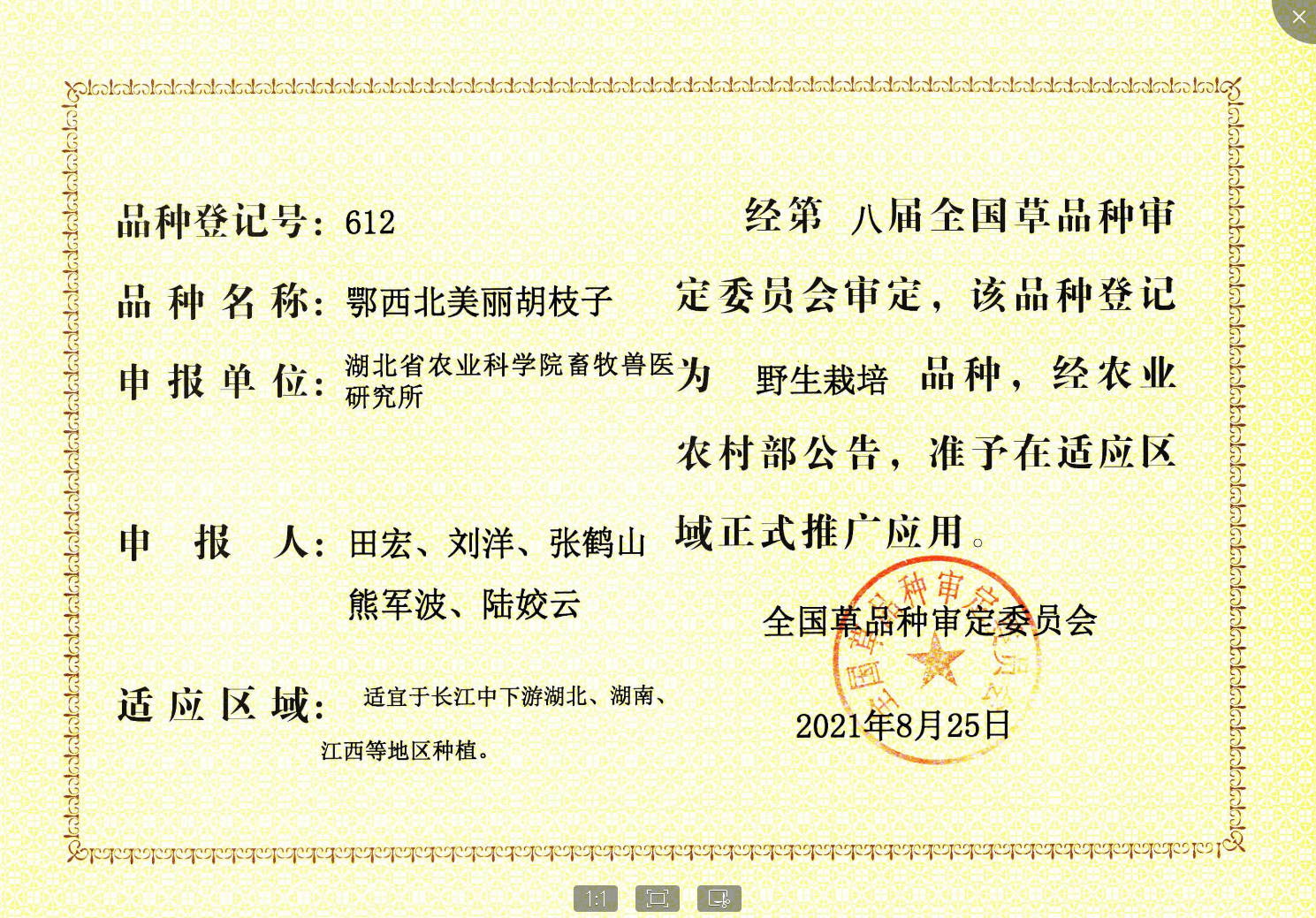 野生美丽胡枝子多年栽培驯化野外育成的野生栽培品种。2021年8月25日通过全国草品种审定委员会审定(612)。豆科,多年生饲用灌木。年干草产量约5000kg/hm2,最高达9500kg/hm2,具有显著丰产性。分枝期(以干物质计)粗蛋白含量13.1%,粗脂肪含量2.19%,粗纤维含量31.8%,中性洗涤纤维含量50.9%,酸性洗涤纤维含量36.9%,粗灰分5.3%,钙含量1.9%,磷含量0.2%。具有耐寒、耐贫瘠、耐高温干旱、抗逆性强、生长期无病虫害发生等特点,既可在丘陵平原,也可在林迹地、撂荒地、坡耕地生长,适宜长江中下游湖北、湖南、江西等地推广种植。